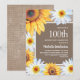 Des tournesols rustiques jaunes et bruns et des marguerites blanches avec de beaux feuilles verts sur invitation de fêtes du 100ème anniversaire en burlap. Parfait pour les fêtes d'été ou d'automne. Contactez-nous pour obtenir de l'aide sur la personnalisation ou pour demander des produits correspondants.