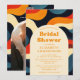 Cette invitation à la douche nuptiale boho super, colorée, rétro, ondulée peut être personnalisée avec vos informations dans la typographie moderne et une photo avec votre code QR d'adresse de registre au verso. Conçu par Thisisnotme©