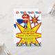 Appel à tous les Superheroes Anniversaire de enfant Party Invitation modèle pour une fête d'anniversaire avec un arrière - plan blanc. Ces Super Hero Invitations mignonnes ont un garçon super-héros avec une cape bleue et un masque de l'oeil rouge avec un "S" sur sa poitrine pour Superhero. À côté du grand personnage de super-héros est une étoile éclat design en rouge et bleu avec l'âge de votre enfant. La bordure supérieure de l'invitation a des super-héros qui volent à travers l'invitation. La frontière du bas a des super-héros debout sur les immeubles le long de la ligne d'horizon de la ville. Le texte de l'invitation est centré dans une grande étoile jaune éclat design. L'arrière de l'invitation a également un super-héros couleur et une autre étoile éclatée en jaune et rouge, avec l'âge de votre enfant. L'arrière - plan de cette invitation est blanc. La police du texte d'invitation est rouge et bleue dans une police de style bande dessinée. Il s'agit d'invitations mignonnes et aux couleurs vives pour les garçons qui aiment les Super Héros ou les personnages de bandes dessinées. Entrez simplement les informations de fête d'anniversaire de votre enfant dans les spots modèles. Utilisez le bouton customiser si vous souhaitez déplacer des éléments ou modifier les couleurs de la police. Ce sont des invitations parfaites pour une fête d'anniversaire de super héros pour les garçons.