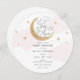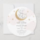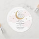 Baby shower invitation avec des nuages et des étoiles rose aquarelle avec lune de gloire dorée et script amusant "Nous sommes sur la lune!" Personnalisez avec vos informations ou cliquez sur "cliquer pour customiser plus loin" pour ajuster le type de police, la taille, la couleur.
