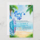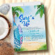 Surf à l'invitation d'anniversaire que vous pouvez personnaliser pour n'importe quel âge. Le design se compose d'une scène de plage aquarelle avec l'océan, palmiers et planches de surf et de lettrage cool. Conception neutre pour un anniversaire de garçon ou de fille et parfaite pour le thème du surf d'été, le thème de l'océan, sous la mer, la fête de la plage ou la fête de la piscine.