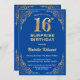 Surprise 16e anniversaire Cadre Parties scintillant bleu et or Anniversaire Invitation. Pour plus de personnalisation, cliquez sur le bouton "Customiser" et utilisez notre outil de conception pour modifier ce modèle.