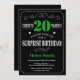 Invitation du 20e anniversaire Surprise Typographie noire et verte. Tableau de bord. Arrière - plan noir et blanc. Anniversaire adulte. Hommes ou Femmes Anniversaire. Enfants Garçon ou fille Ado Anniversaire adolescent Invitation . 13ème 15ème 16ème 18ème 20ème 21ème 30ème 40ème 50ème 60ème 70ème 80ème 90ème 100ème. N'Importe Quel Âge. Pour plus de personnalisation, cliquez sur le bouton "Customiser" et utilisez notre outil de conception pour modifier ce modèle.