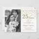 Invitation 25e Anniversaire de Mariage avec Photo. Design élégant en or et blanc avec police script et confettis. Peut être personnalisé pour afficher n'importe quelle année de mariage. À 25 ans de mariage !