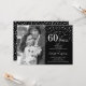 Invitation surprise pour les 60 ans de mariage avec photo. Design élégant en noir et argent avec police de caractères script et confettis. Peut être personnalisé pour afficher n'importe quelle année de mariage. À 60 ans de mariage, félicitations !