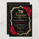 Invitation surprise 70e anniversaire. Dessin noir féminin, rouge avec parties scintillant en or. Comprend des roses rouges, des caractères de script et des confettis. Parfait pour une soirée d'anniversaire élégante. Peut être personnalisé pour montrer n'importe quel âge. Message-moi si vous avez besoin d'une personnalisation plus poussée.