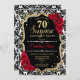 Invitation surprise 70e anniversaire. Dessin noir féminin, rouge avec parties scintillant en or. Caractéristiques damask pattern, roses rouges, police de script et confetti. Parfait pour une soirée d'anniversaire élégante. Peut être personnalisé pour montrer n'importe quel âge. Message-moi si vous avez besoin d'une personnalisation plus poussée.