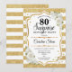 Invitation surprise 80e anniversaire. Design féminin avec parties scintillant d'or faux. Comprend des rayures, des roses blanches, des caractères de script et des confettis. Parfait pour une soirée d'anniversaire élégante. Peut être personnalisé pour montrer n'importe quel âge. Message-moi si vous avez besoin d'une personnalisation plus poussée.