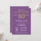 Invitation surprise 80e anniversaire avec Arrière - plan de Parties scintillant violet et or. Tableau de bord. Anniversaire adulte. Hommes ou femmes Anniversaire Invitation. Quel que soit l'âge. Pour plus de personnalisation, cliquez sur le bouton "Customiser" et utilisez notre outil de conception pour modifier ce modèle.