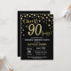 Surprise 90e anniversaire Invitation avec Parties scintillant noire et or Arrière - plan diamant. Confetti d'or. Anniversaire adulte. Hommes ou Femmes Anniversaire. Pour plus de personnalisation, cliquez sur le bouton "Customiser" et utilisez notre outil de conception pour modifier ce modèle.
