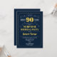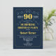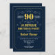 Invitation surprise 90e anniversaire. Elégant design rétro bleu marine et jaune or. Salutations à 90 ans! peut être customisé pour montrer n'importe quel âge.