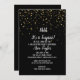 Invitation Surprise en or avec confettis sur fond noir pour l