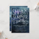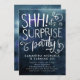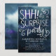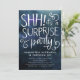 Elégante invitation pour un anniversaire surprenant adulte avec arrière - plan bleu marine couleur aquarelle avec texte de typographie blanche qui dit "SHH! c'est une fête SURPRISE" avec tourbillons. Customisez cette carte de modèle en ajoutant vos propres informations de fête.