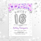 Douce invitation de fête de 16 ans. Design élégant en argent faux parties scintillant avec accent floral. Carte Invitation avec le numéro d'argent 16 ballons, police de script avec confetti. Violet et blanc. Parfait pour une célébration anniversaire de style seizième. Message-moi si vous avez besoin d'âge personnalisé.