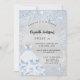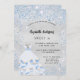 Pour un élégant Sweet 16, 16e anniversaire. Un arrière - plan métallique à l'aspect faux argenté. Décoré de poussière de parties scintillant en faux bleu et d'une robe pour une fête d'hiver sur le thème du pays des merveilles. Personnalisez et ajoutez un nom, un âge et des détails de la fête. Le nom est écrit avec un script de style manuscrit