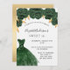Une invitation moderne, élégante et glamour pour une fête Sweet 16, 16e anniversaire. Sur le devant : Un arrière - plan blanc avec une robe vert émeraude et des roses verts, fleuris. Le nom est écrit avec un script de style moderne écrit à la main. Personnalisez et ajoutez les détails de votre fête. Dos : faux arrière - plan or.