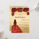Une invitation moderne, élégante et glamour pour une fête Sweet 16, 16e anniversaire. Un arrière - plan en faux or avec une parties scintillant en faux or, une fille portant une robe rouge et or et des roses rouges, des fleurs. Le nom est écrit avec un script de style moderne écrit à la main. Personnalisez et ajoutez les détails de votre fête.