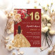 Une invitation moderne, élégante et glamour pour une fête Sweet 16, 16h anniversaire. Un arrière - plan rouge, une fille portant une robe dorée et des roses rouges, roses et dorés, des fleurs. Le nom est écrit avec un script de style moderne écrit à la main. Personnalisez et ajoutez les détails de votre fête.