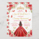 Celebrate her milestone in style with this elegant Sweet 16 invitation featuring a brunette girl in a sparkling red ball gown, viewed gracefully from the back. Surrounded by soft florals, fluttering butterflies, and a regal golden crown, the design blends youthful charm with royal sophistication. The color palette includes bright red, shimmering gold, and soft leafy greens—perfect for spring or summer celebrations. Ideal for princess-themed parties, this invitation sets a magical tone for an unforgettable evening.