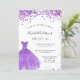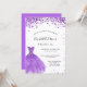 Une invitation moderne, élégante et glamour pour une fête Sweet 16, 16e anniversaire. Sur le devant : Un arrière - plan blanc avec violet, lilas pétille, une robe violette. Le nom est écrit avec un script de style moderne écrit à la main. Personnalisez et ajoutez les détails de votre fête.