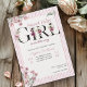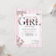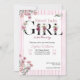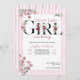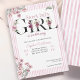 Célébrez l'arrivée prochaine d'une petite fille douce avec cette charmante invitation au baby shower floral. Avec ses rayures roses douces, son écriture élégante et ses délicats accents floraux, c'est le parfait mélange de féminin et de fantaisie pour une réunion joyeuse en l'honneur de maman-to-be. Grandes lettres florales orthographier GIRL est la caractéristique principale avec le texte Sweet baby girl est en route.