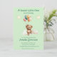 Un mignon ours en peluche accroché à un tas de ballons colorés vole à travers les nuages avec un couple d'étoiles au-dessus de la faire-part "Un petit bonhomme est en route." Tout le texte peut facilement être modifié à vos informations.