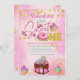 Sweet One desserts thème girly coloré 1er anniversaire invitation, avec des cupcakes, beignets, gâteaux et autres douceurs, conçus avec des éléments dessinés à la main dans des couleurs pastel rose, violet, turquoise, et faux or avec des éléments de parties scintillant en faux or.
