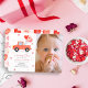 This cute and modern girl's sweetheart 1st birthday photo invitation features a pink truck with balloons and hearts. The reverse side features a light pink background with heart shaped candies. Perfect for the Valentine's Day birthday! Personalize for your needs. You can find matching products at my store.