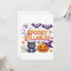 Une illustration festive sur le thème d'Halloween représentant la phrase "SYLLABES EFFRAYANTES" en grandes lettres dégradées orange et violet. Autour du texte se trouvent divers personnages de dessins animés et objets : un fantôme blanc joyeux, deux chauves-souris heureuses pendues, un chat noir adorable, une citrouille souriante avec un visage sculpté et un chapeau de sorcière violet sur le dessus, des crânes, des os et des morceaux de maïs sucré. Le fond est sombre avec des étincelles d'étoiles éparpillées.