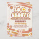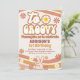 Retro Daisies Peace Sign Two Super 2nd Birthday Invitation style rétro deuxième anniversaire invitation pour une petite fille avec un titre de police rétro décoratif, quelques marguerites, et signe de paix sur un arrière - plan multicolore dans les tons chauds. Cette invitation de deux super filles pour le 2ème anniversaire est idéale pour une fête de premier anniversaire sur le thème des années 60 ou rétro.