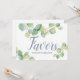 Conçu pour correspondre à ma collection de mariages de verdure d'eucalyptus aquarelle, cet élégant panneau botanique invitation les invités à prendre une faveur. Personnalisez avec deux lignes de texte personnalisé en calligraphie et en lettres de bloc (avec "Favors; prenez-en une"). Conçu avec une bordure supérieure de mon aquarelle d'origine, l'art feuillage d'eucalyptus est des tons verts. Ajoutez votre touche personnelle avec un cadre 5x7. Pour voir la suite de papier à lettres mariage correspondante, visitez www.dotellabelle.com/vginvites