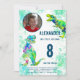 Colorful Roaring Tyrannosaurus rex dinosaure invitation fête d'anniversaire avec cool bleu et turquoise vert de l'arrière - plan splash. Fun T-Rex dino 8ème anniversaire invitation pour l'enfant qui aime les dinosaures. Les fans de dino jurassique préhistorique vont adorer ce design psychédélique multicolore Tyrannosaurus rex. Typographie modèle photo et moderne avec facile d'utilisation modèle juste ajouter un numéro personnalisé de l'anniversaire et les détails de la fête et vous êtes tous prêt pour un anniversaire amusant de dinosaures bondée thème anniversaire. Toutes les espèces de dinosaures sont les bienvenues. Illustration originale de Catherine Sweetman