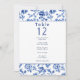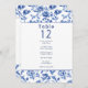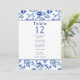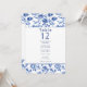 Cette élégante carte de sièges présente la même palette de couleurs bleu et crème intemporelle avec un cadre vintage fleuri, créant un look cohésif qui complète votre thème mariage. Chaque numéro de table est affiché en évidence avec une liste de noms en dessous pour faciliter l'agencement des sièges. La bordure florale complexe et la typographie raffinée assurent que ce tableau de sièges est non seulement fonctionnel, mais aussi un ajout sophistiqué à votre décor de réception. Parfait pour les mariages formels, ce design allie tradition et élégance, guidant vos invités à leurs sièges avec style.