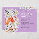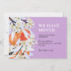 Elégante et chic nouvelle carte de faire-part mobile maison avec de belles branches tangerines florissantes et texte "Nous avons déménagé". Carte botanique florale aux fleurs et agrumes délicats au printemps. Orange, pastel et lilas. Ajoutez vos noms et votre adresse.