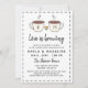 Invitation de douche de mariage pour un couple LGBT charmant avec deux tasses de café et un cœur de fierté arc-en-ciel entre les deux. Ajoutez vos initiales sur les tasses. L'amour est en train de se préparer dans un script brosse charmant. Ajoutez le texte et les informations de votre invitation dans une police soignée, en noir sur fond blanc.