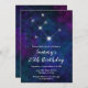 Cette invitation d'anniversaire cosmique et céleste présente la constellation zodiaque du Taurus sur un arrière - plan de galaxie bleu foncé et violet à étoiles dispersées. Le texte combine écriture manuscrite et polices serif modernes pour un look élégant et classique. C'est parfait pour les soirées à thème astrologique.