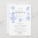 Un modèle d'invitation à la fête du thé baby shower moderne, élégant et chic, illustrant un élégant set de thé bleu avec de délicats recouvrements de dentelles boho chic (c'est un effet numérique). Le titre, "A Sweet Little Baby Boy is Brewing", dans la calligraphie de script moderne et des plats délicats. Parfait pour un garçon baby shower tea party qui est élégant, classe et moderne, un baby shower de tea party et pour les mamans qui aiment la calligraphie et la typographie de scénario classique. Personnalisez chaque ligne de texte.