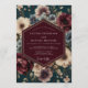 This design exudes a dramatic and moody romance, reminiscent of a vintage baroque still-life painting. A deep teal backdrop sets the stage for a lush tapestry of opulent florals. Blooms in rich burgundy, cream, and dusty blue, including elegant anemones and lush peonies, create a truly sumptuous composition.