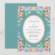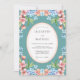 This watercolor design features a vibrant teal blue background adorned with a symmetrical border of pink cherry blossoms and light blue hydrangeas. Soft green foliage provides a natural touch to the artistic floral arrangement. The overall aesthetic is cheerful and romantic, perfect for a spring or summer seasonal event. The palette balances bold jewel tones with delicate pastel accents.