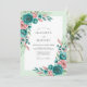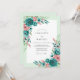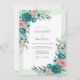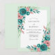 This design features a lush arrangement of watercolor teal and blush pink peonies. Delicate mint green foliage provides a soft, airy backdrop for the vibrant floral clusters. The painterly style creates a romantic and sophisticated aesthetic perfect for a seasonal spring event. Vibrant turquoise blooms pair beautifully with soft pastel accents for a fresh botanical look.