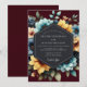A dramatic and artistic design featuring a stunning floral arrangement. Bold teal and sunny yellow blossoms pop against a deep burgundy backdrop, creating a moody yet vibrant atmosphere. Painterly sunflowers and anemones are nestled among soft green foliage for a lush, botanical aesthetic perfect for an autumn affair.