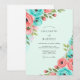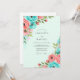This design showcases a vibrant arrangement of teal and coral watercolor blossoms. Intricate ranunculus petals and soft pink buds are nestled among verdant leaves, creating a fresh and romantic aesthetic. The airy palette and hand-painted style evoke a cheerful atmosphere for a seasonal outdoor ceremony.