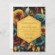 A dark, opulent backdrop showcases richly hued blooms in deep teal and warm golden tones. Lush foliage and delicate berry clusters add depth to this romantic, twilight-inspired botanical design. Evokes a sense of moody elegance for a special occasion.