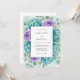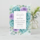 This serene design features a lush arrangement of watercolor teal hydrangeas and soft lavender roses. Delicate silver dollar eucalyptus leaves and subtle gold foliage accents create a sophisticated botanical atmosphere. The airy palette of cool tones evokes a refreshing and elegant mood for a formal or outdoor event.