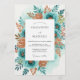 This design features a dramatic watercolor wash of teal, accented with vibrant burnt orange blossoms and autumnal foliage. The artistic brushstrokes create a rich, botanical-inspired aesthetic with a touch of rustic charm. Perfect for a romantic, nature-infused occasion.