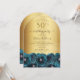 This elegant arch shaped 50th birthday party invitation features a border of teal watercolor roses on a faux gold background. Personalize all of your party details in modern script calligraphy. Designed by Susan Coffey.