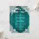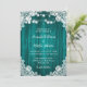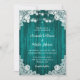 Romantic teal rustic chic wedding invitation featuring white floral lace and string lights on a wood background. Perfect card design for inviting your guests to your romantic rustic teal wedding party.