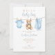 Cette invitation de baby shower adorable présente des vêtements de bébé garçon bleu sur un fil à linge et peut être personnalisée avec vos informations dans une typographie élégante. Conçu par Thisisnotme©