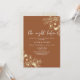 Dégustez votre dîner de répétition avec notre élégante invitation, ornée de motifs botaniques modernes dans des teintes apaisantes en terre cuite. La dentelle florale dorée complexe ajoute une touche d'opulence, tandis que le script de calligraphie simple écrit à la main donne un charme personnalisé. C'est une invitation qui promet une soirée de chaleur, de rires et de moments chéris, une célébration où chaque détail reflète une élégance raffinée et un style intemporel.