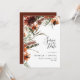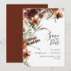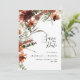 Cette invitation de mariage élégante et naturelle comporte des fleurs rustiques de terre cuite et de rouge foncé aquarellées, des feuilles sèches et des brindilles. Design moderne et tendance.